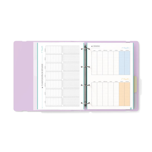 Incluye recambio Oxford 5x5 mm de 100 hojas, 4 separadores de polipropileno, y extras como calendario, planning anual y tracker de estudios, ideales para mantener el orden durante todo el curso.