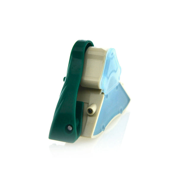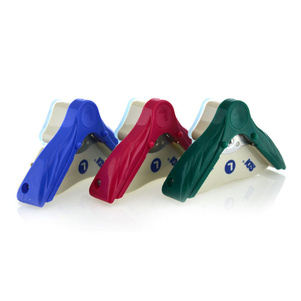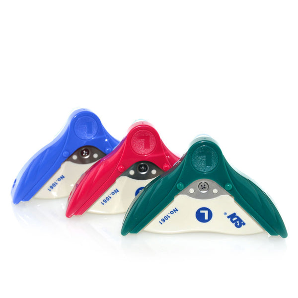 Dispone de deposito integrado para los recortes y esta disponible en tres colores: azul, verde y rojo.